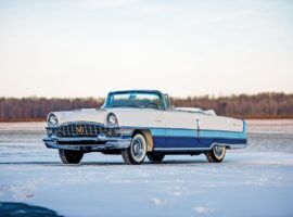 Offered from the Gernatt Collection 275-hp, 352-ci V8 automatic Frame-off restoration 2016 White Jade, Zircon, Sapphire Power windows, seat, top, steering and brakes Clock and Wonder Bar radio Chrome wires, shod with wide whitewalls Packard’s most deluxe model for 1955 and one of only 500 produced