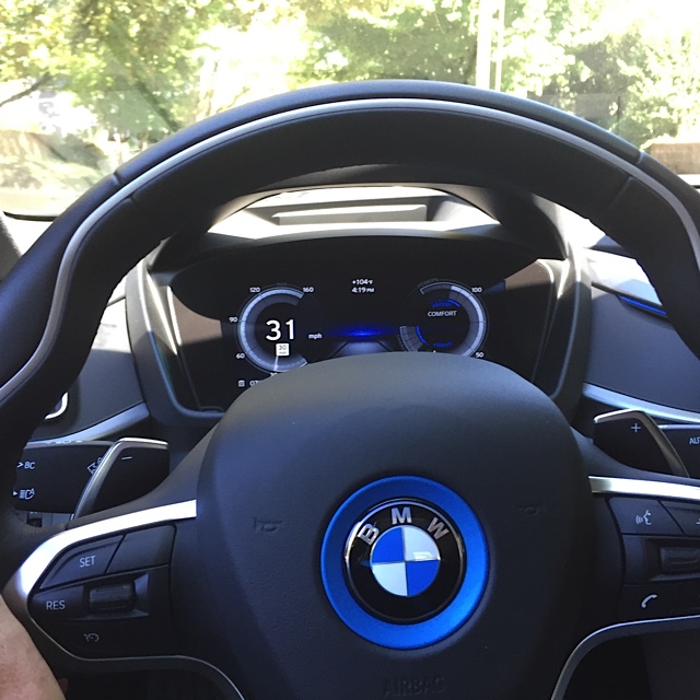 It’s behind the wheel that things get interesting. The i8 has both a combustion engine and an electric one. Together, they produce 357 horsepower and 420 ft-lbs of torque. This translates into silent propulsion when in comfort (battery pack) mode and a rorty exhaust note in sport (combustion engine) mode.