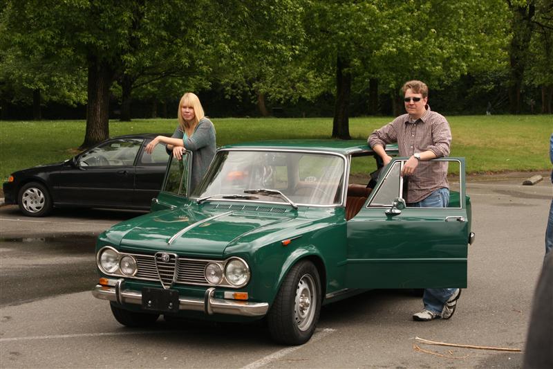 The SCM office crew hit the road on Friday for an extended lunch. A dozen of us piled into three old cars — our 1964 Chevrolet Nova wagon, our newly acquired 1967 Alfa Giulia Super (the green one in the pictures) and Bill Gillham’s Giulia Super “Hooligan” (blue) — and one modern one — our 2007 Maserati Quattroporte.