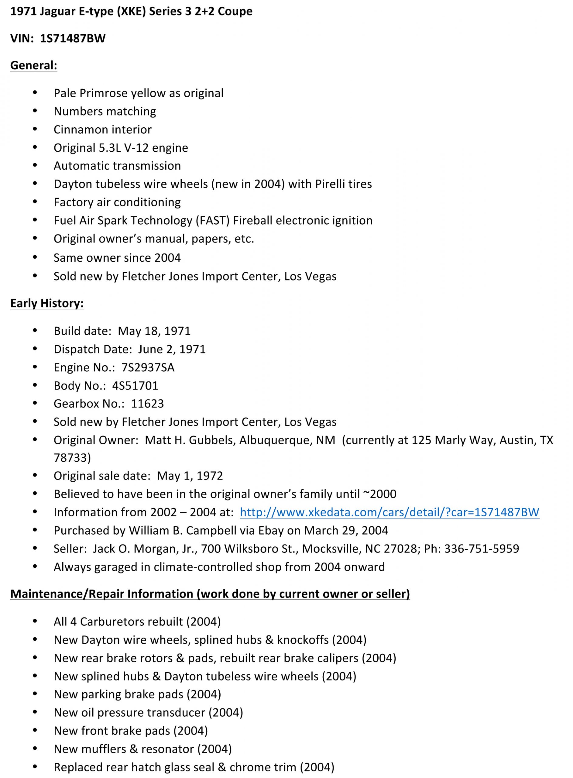He later sold the car to his son and the trail goes cold there until it was purchased on eBay in 2004. The historical timeline is included below.