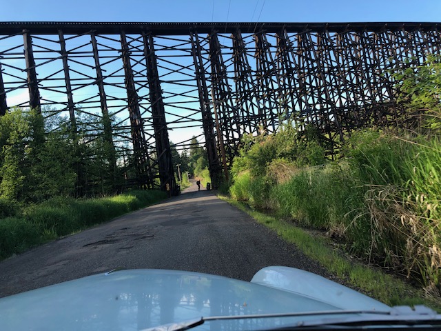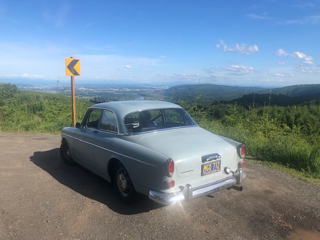The Volvo is back home. Christ Bright, a neighbor in my condo building — and owner of a Ferrari 348 and 1,300-cc Giulia Super Nuovo — came along for a 50-mile drive through the lush Oregon countryside. We ended up by the wooden railroad trestle near Old Cornelius Pass Road. The 122 performed flawlessly. Of course.