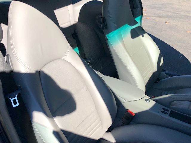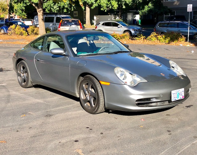 It’s a 2003 996 6-speed coupe with sunroof. It’s an unusual and attractive seal gray with a light gray interior. The wheels have been powder-coated a dark gray. The VIN of the Porsche is WP0AA29973S620903.