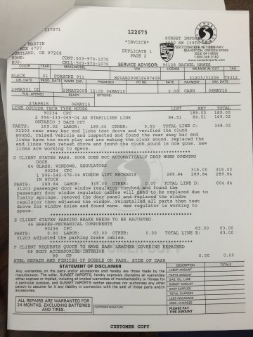Being a member of the Porsche Club of America entitled me to some discounts, which brought the final price down from about $4,200 to $3,715.36. Given that the original MSRP of the car was $114,000 ($151,000 in today’s dollars, or about the price of a 2015 911 Turbo), the cost of the service was quite reasonable. Further, Sunset Porsche warrantees their work for 24 months.