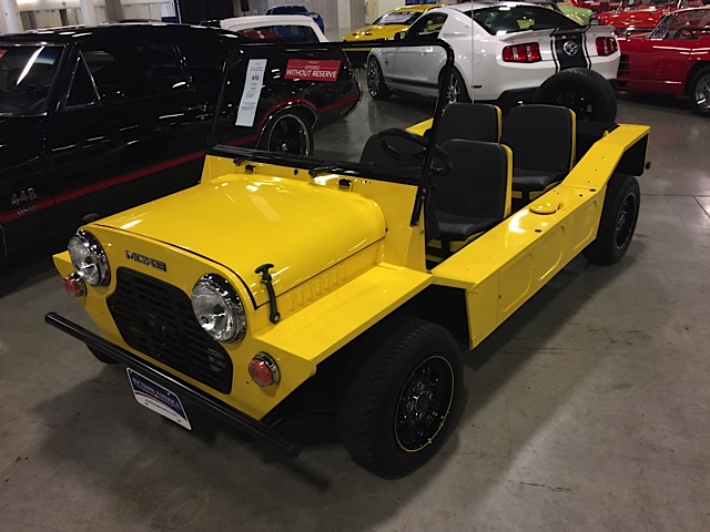 The second car I flirted with was a bright yellow Mini Moke. Restored to a nice cosmetic standard — but not correctly — it was offered without reserve and with an estimate of $14,000-$18,000. I’ve always liked these little toy cars, and this one was perfect for puttering around Portland.
