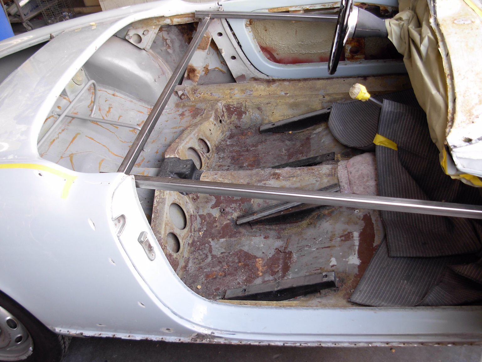 The 1965 Alfa Romeo Giulia Spider Veloce (pictured above) went to Bill Gillham’s for minor rocker repair. That has turned into major surgery, as there was rust lurking that needed to be addressed. Also, Gillham is replacing the trunk floor, which is no small job in these cars, given the way the upper and lower fenders attach to the floor. In addition, he discovered that the car was hit in the right rear some time in the distant past. Rather than repair the fender, someone simply welded a new one over the damage. Figure a couple of months until this car is ready.