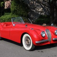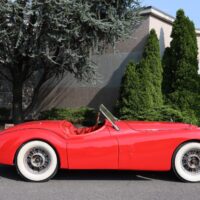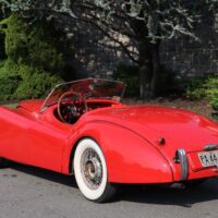 This 1952 Jaguar XK120 Roadster is a matching numbers example wearing an older restoration. Red with black interior. Just out of an estate, it was last running about 8 years ago and the motor turns freely. Prior to being parked the suspension was all rebuilt. The car has been converted to a 12-volt system with an alternator. It also comes with fender skirts and an extra set of wire wheels. The older restoration is showing its age in a few areas like the paint and chrome. This car has a lot of potential. It wouldn’t take much to turn it into a great driver. This desirable XK120 Roadster is not to be overlooked by any passionate Jaguar enthusiast or collector alike.