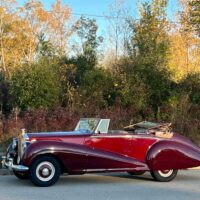 This Left-Hand Drive 1953 Rolls-Royce Silver Dawn Drophead Coupe by Park Ward is an extremely handsome original example that runs and drives well. Burgundy with tan leather interior and retaining its original engine. It is one of the very few examples of the coachbuilt Silver Dawn available. The Rolls-Royce Silver Dawn was a surpassingly rare basis for custom coachwork, with only 64 examples being released by the factory as a bare chassis. Chassis number LSNF41 was one of five Silver Dawns bodied by Park Ward to their design number 99, of which four, including this one, were left-hand-drive.