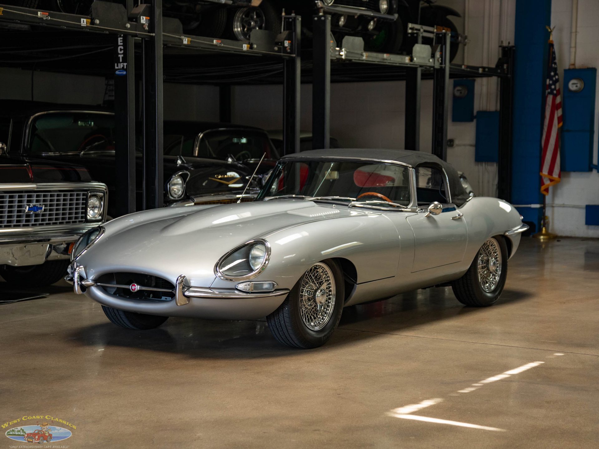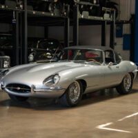 Frame-off restored example of this very handsome roadster in ‘Silver’ with a Black interior trim. Highly desirable upgraded German Getrag 5 speed manual transmission and with the 4.2L 265HP 6 cylinder engine with triple SU carburetors and with a Black interior with wooden steering wheel and original five factory chrome wire knock-off wheels and tools! Chassis # 1E11120, Engine # 7E148798.