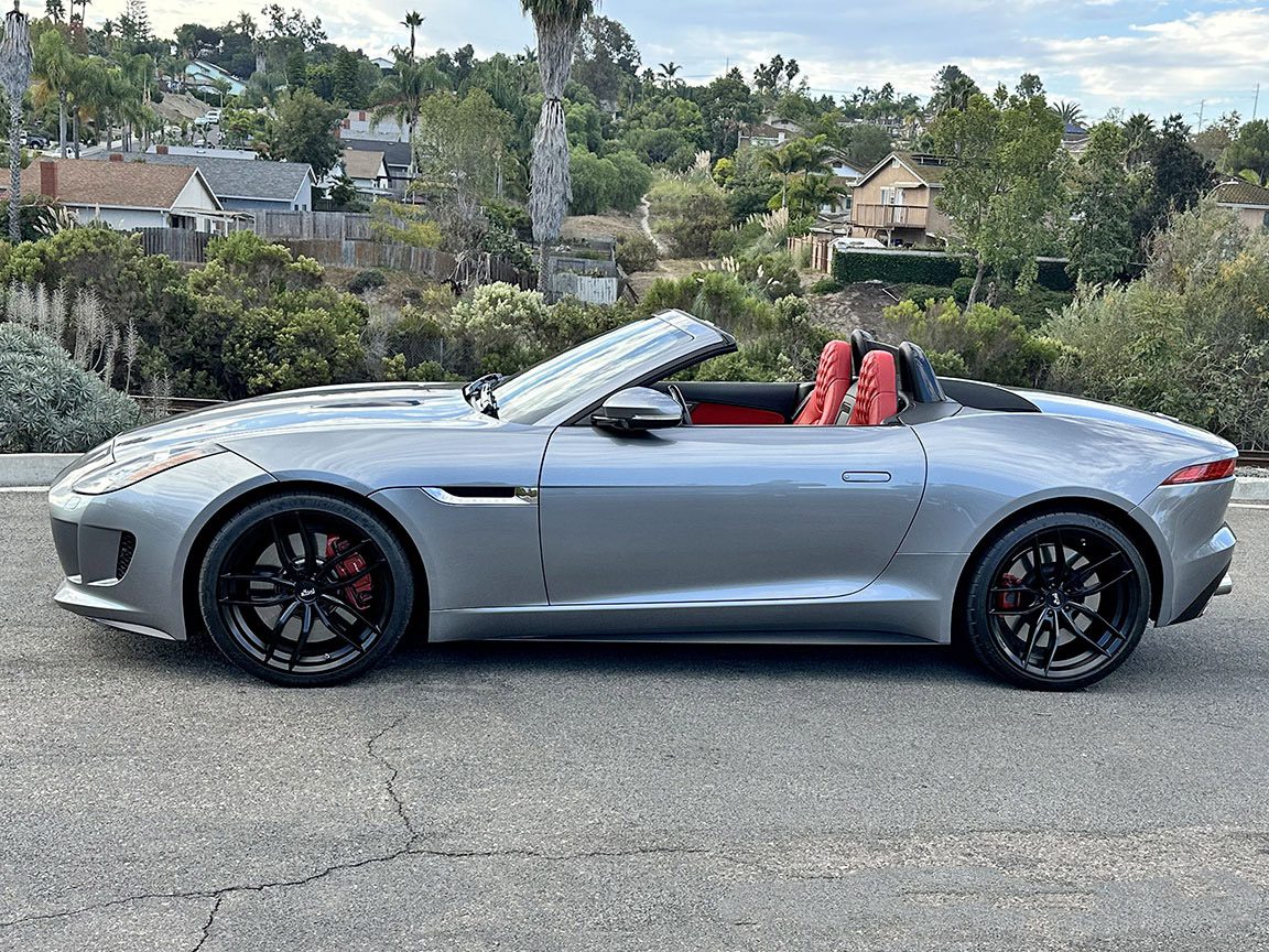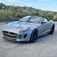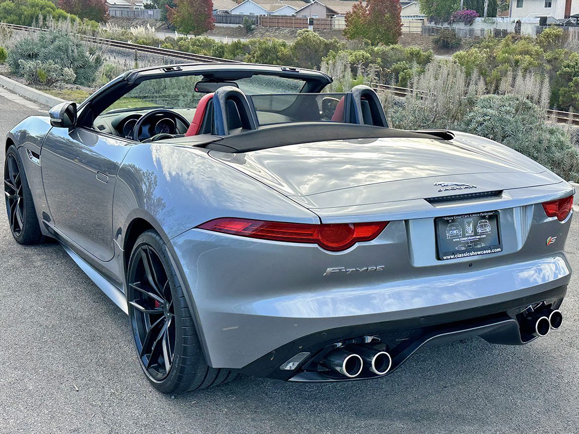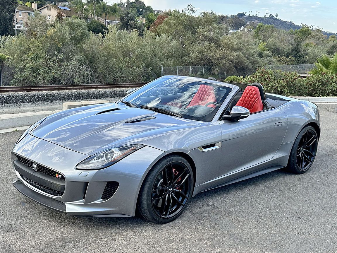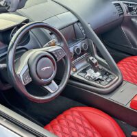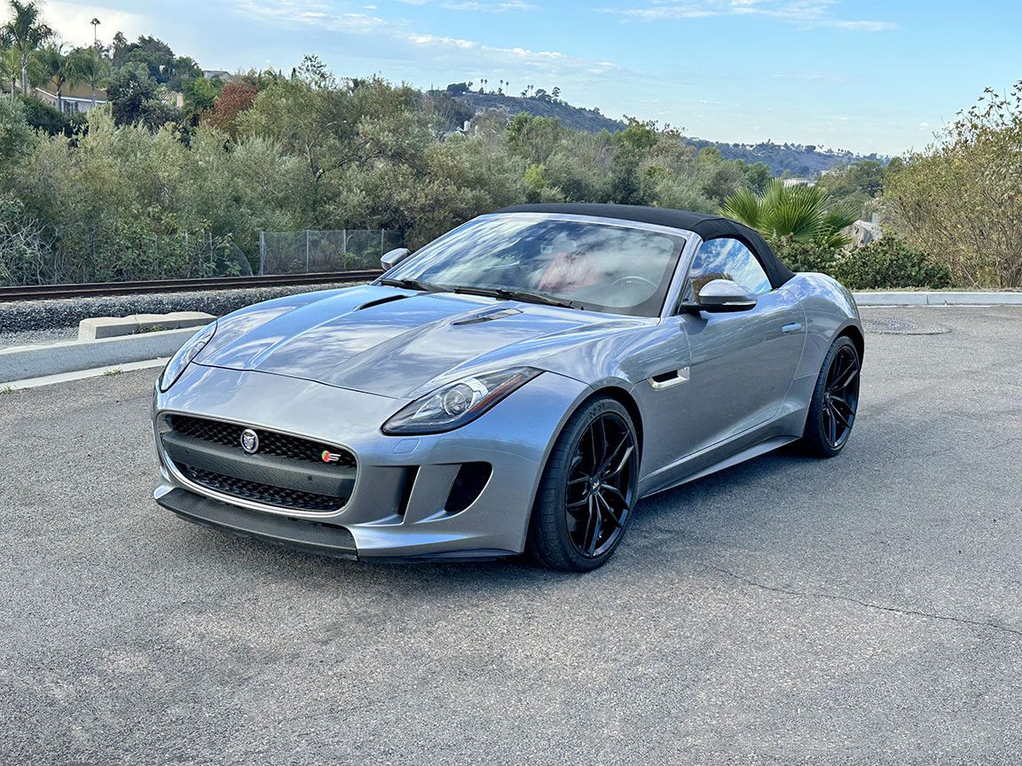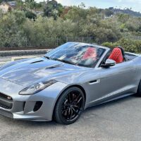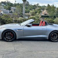 2014 Jaguar F-Type S Convertible finished in Metallic Gray with red leather interior and carbon-fiber accents. Powered by a 495-hp supercharged 5.0L V8 with ZF 8-speed paddle-shift automatic, 0–60 in 3.8 seconds. Highly optioned with performance brakes, sport seats, premium trim, and 20″ alloy wheels. Meticulously maintained and turnkey.