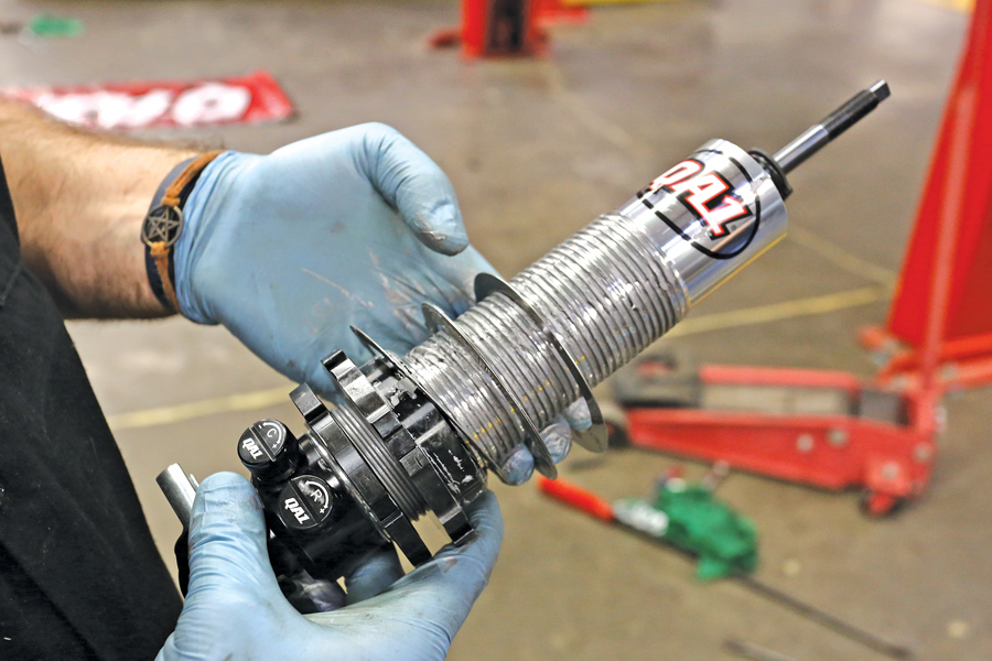 Next comes the spring, in this case a 550-pound unit to handle the heft of a heavy Chevy with a big block under the hood. It slides down over the shock and sits, tapered side down, on the adjusting nut. Note the two knobs at the base of the shock — this is QA1’s double adjustable Pro Coil shock, which features independent compression and rebound adjustments. Also note we have the height adjustment set at its lowest possible point.