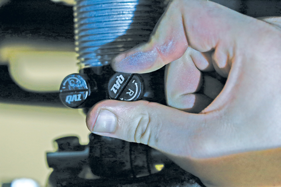 Reinstall the wheels, drop the car, and bounce it to seat the suspension. With all four knobs at zero, the car bounced like it had no shocks installed. Each knob has 18 settings, so we gave each nine clicks of firmness to start.