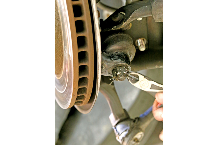 Reinstall the castle nut and torque it. Be sure to install a new cotter pin to retain the nut. Reinstall the strut-rod link to the lower control arm, as well as the sway-bar end links. Also tighten up the upper shock-mount nut — but only enough to expand the rubber bushing out to its washer.