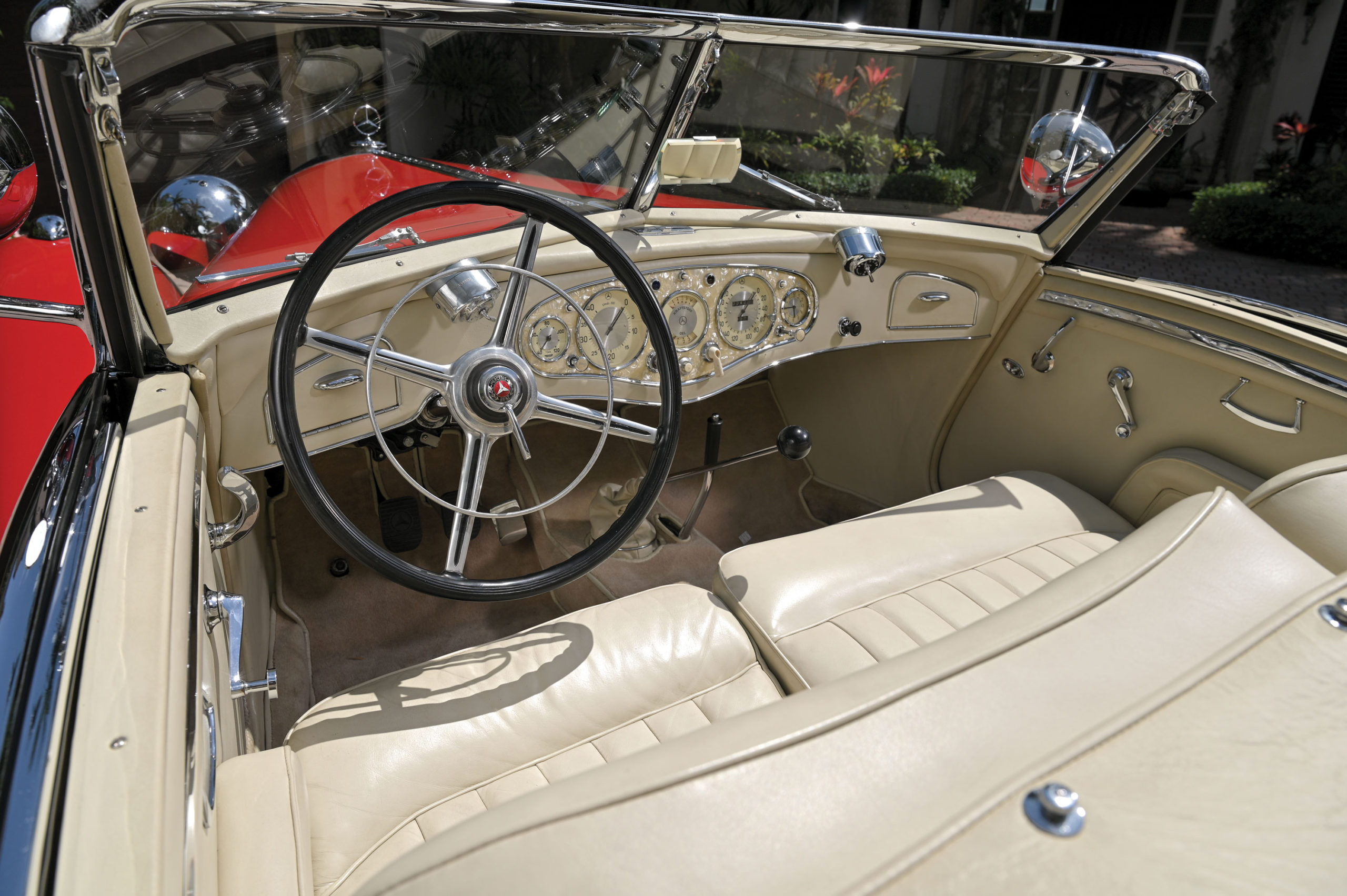 Melin’s research indicated that the Stuttgart coachbuilder’s order stated this car was a Spezial Roadster. It was likely a one-off variation due to its unusual chrome flashes along the sides of the front and rear fenders, as well as a distinctive chrome “waterfall” grille protector that curved forward at the base and extended between the chassis dumb-irons along with chrome covers on the twin rear-mounted spare tires.