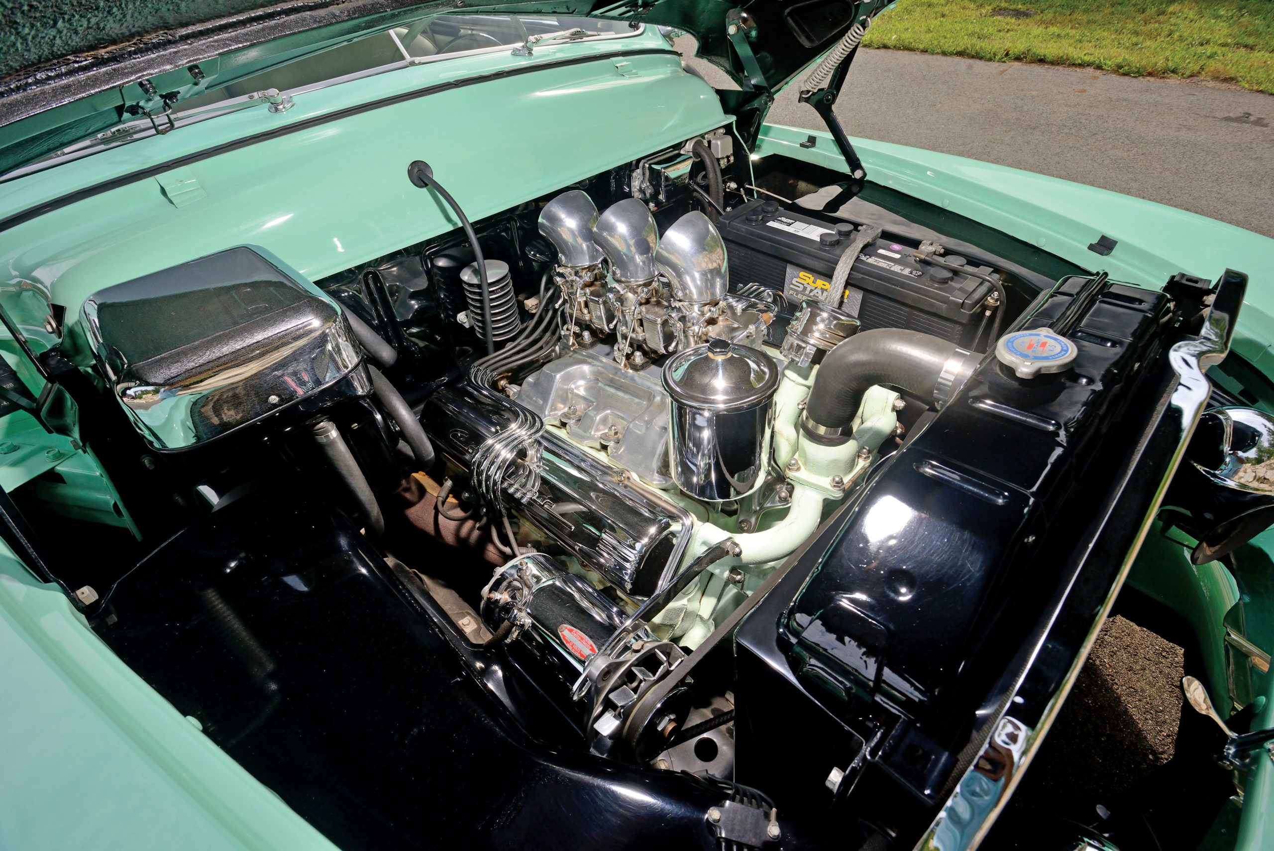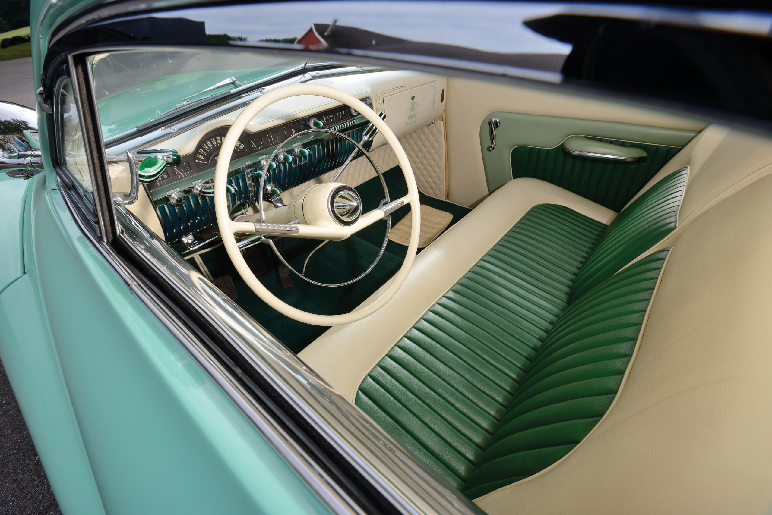 To break up its slab sides, the Mercury’s original designer, E.T. “Bob” Gregorie, penned a subtle reveal that gently dipped partway along the side of the car, reminiscent of the sheerline of a yacht. For a more dramatic accent, Sam Barris affixed chrome trim spears from a ’53 Buick and used that divider to separate the car’s original shades of light and dark green lacquer.