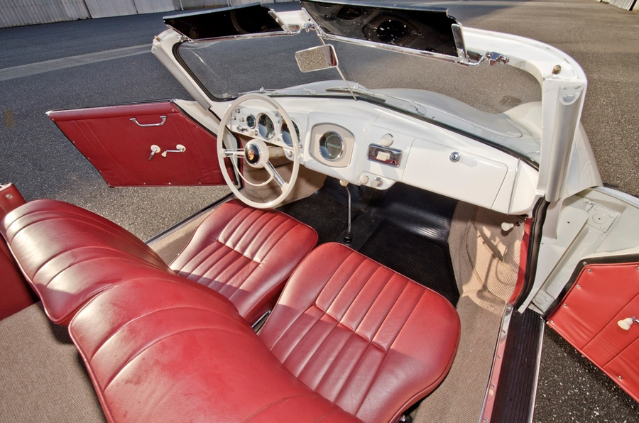 Number 60266 is confirmed by the included Porsche Certificate of Authenticity and Kardex as a USA-spec, pre-A 1500. It has been restored in the original R504 Ivory exterior, over a red leather interior with black convertible top.