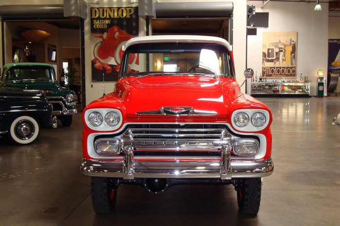 This 1958 Chevrolet Apache Cameo Carrier is the rarest of the Cameos, and it was the last year it was produced. Just 1,405 were made for 1958, and only a few were fitted with the NAPCO 4×4 system. This Cameo was treated to an exhaustive, no-expense-spared, frame-off restoration to the most exacting standards. The truck has been driven only five miles since the restoration was completed. This is its first time offered for public sale at auction. It is a two-owner truck from new, with known history from new.