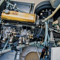 The original design anticipated using the 4-cylinder Climax FPF racing engine in 2.0- or 2.5-liter displacement, though Cooper was happy to sell cars without engines, and several ended up with 2.5-liter Maserati power. Engines were mated to the Citroën-ERSA 4-speed transaxle (Parisian case, all custom British internal gears; also from Formula 1), the first to be able to handle the torque of the 2.5-liter engine. The body was formed of aluminum, which in today’s world is immensely important in terms of collectibility, and it continued to use the transverse-leaf-rear-spring setup.