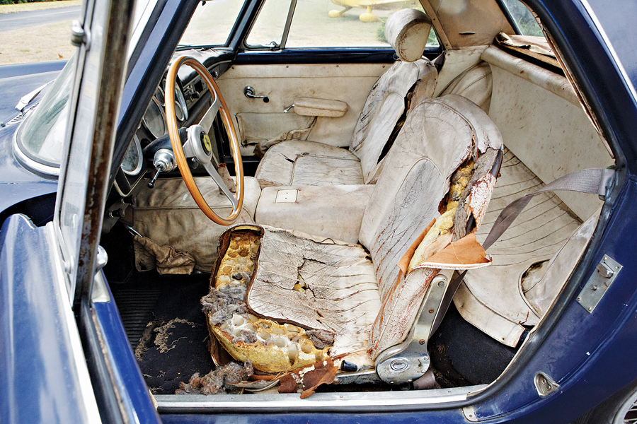 A sizeable patch of leather on the driver’s seat had been lost to dry rot, and the balance of the interior leather was as stiff as cardboard. The carpet, headliner, trunk lining and hood pad fared no better.