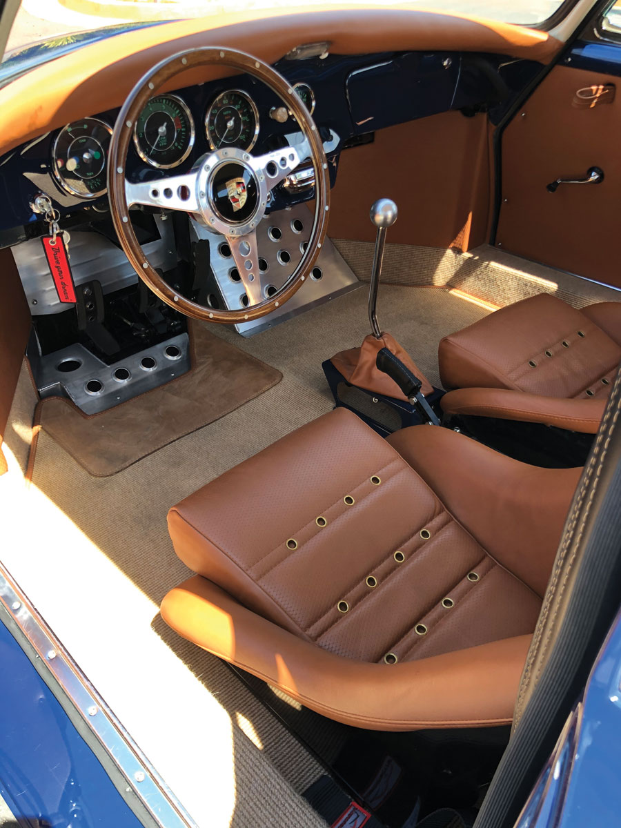 Our auction car was a 1964 356C reconstructed on a tube frame. The builder was Mike Colucci (of Brumos Racing) with a full 6-cylinder, 2.8-liter 911 engine and a custom KW coil-over suspension. The Albert Blue bodywork and brown custom interior were well executed at known shops. The car’s magic was mechanical, with a body that was not very customized other than the obviously needed widening and some cooling louvers under the rear deck lid.