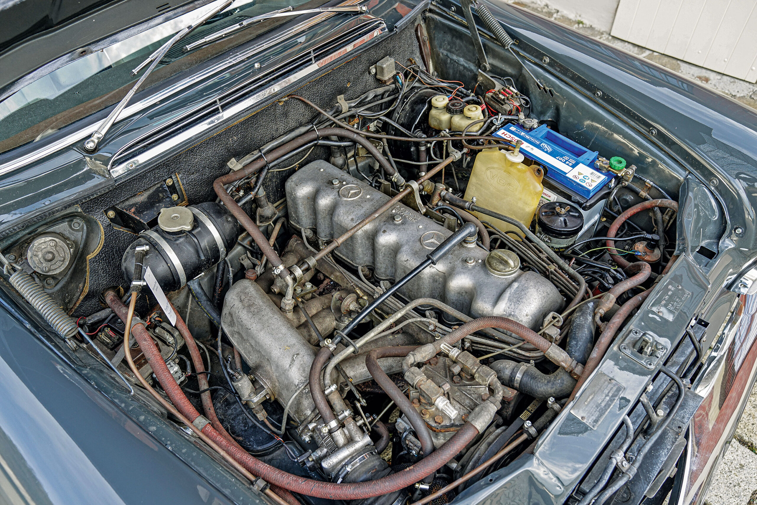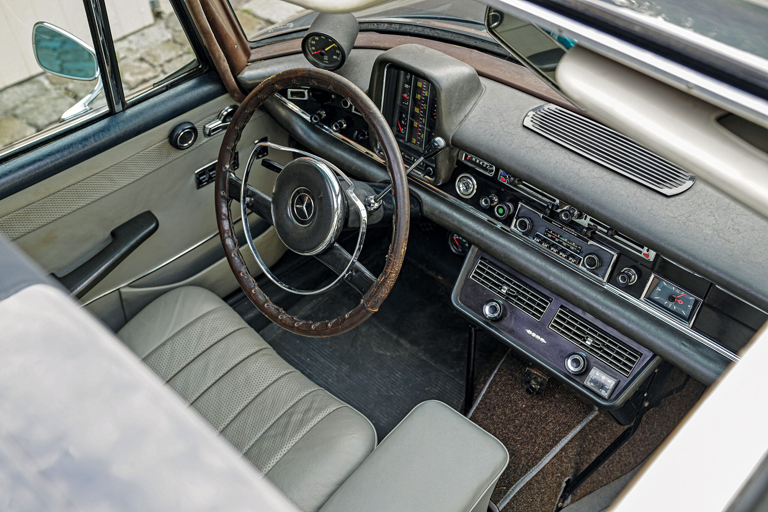 Herr Werner Kurras placed an order for a second-series 230 “fintail” through the official Mercedes-Benz dealer, Kirstein & Sauer GmbH, of Bielefeld, on March 21, 1966, for 20,912 Deutsche Mark. The following year, chassis 026864 was delivered, finished in Graphite Gray over a Light Gray leather interior, and equipped with a 2.3-liter engine that delivered 120 PS. Herr Kurras clearly enjoyed his 230, as by June 1972 it had covered 109,524 kilometers. Yet perhaps the owner pined for a hint of added oomph. It is at this point that the car was presented to AMG for a performance uplift.
