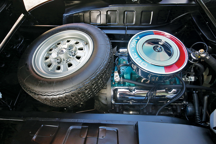 Chassis and body parts were purpose-designed, while other items were sourced from AMC and external suppliers. Power was supplied by AMC’s 390-ci V8 engine, rated at 340 hp and mated to a 4-speed gearbox/ rear transaxle supplied by OTO Melara.