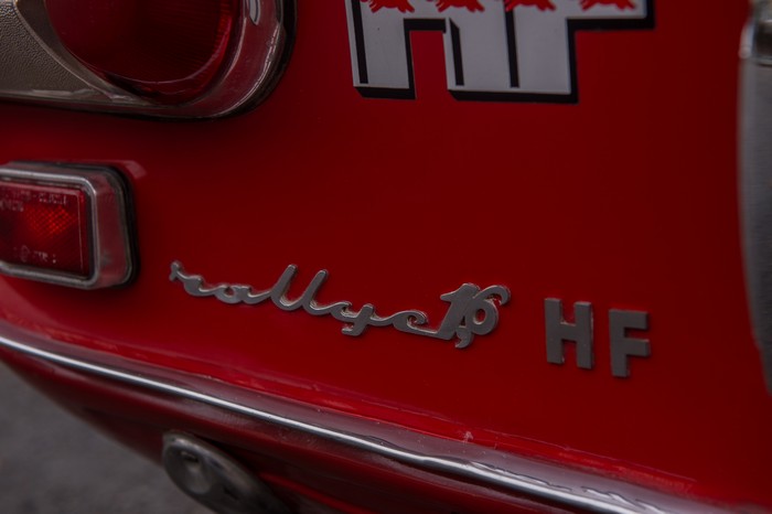 In total, 1,258 1.6 HFs were built during 1969–70, of which approximately the first 600 were designated HFS and fitted with the Variante 1016 engine featuring modified cams similar to the Works rally cars. This car, 001578, which is a rare fanalone (big-headlight) version, is one of the last HFSs to be built and is contemporary with cars used by the Works in late 1969/early 1970. Believed to have been used as a reconnaissance car by the Works team, it still has various Works parts including inlet manifolds, 45-mm Dell’Orto carburetors, 10,000-rpm tachometer and Abarth steering wheel, although the 1016 engine has been replaced.