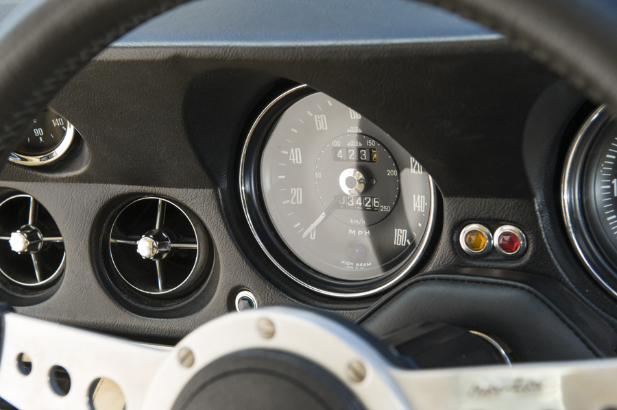 Inside, it had been retrimmed with new leather and carpets, and the dash was very sharp, with no cracks or scratches in the plastic molding; later cars got wood veneer. Also, the eyeball vents still showed their chrome finish which earlier cars often lose, leaving unattractive ivory-colored plastic for which replacements are not available. It wore an alloy three-spoke steering wheel — an improvement on the original heavy-looking plastic two-spoke design.