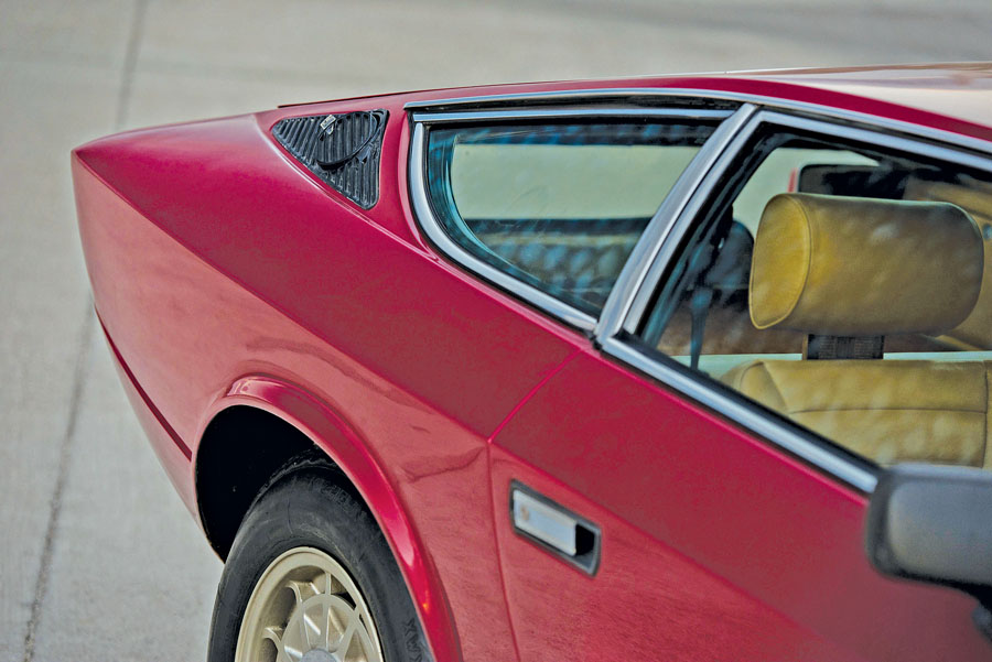 The federal government brain trust decreed that the really clever rear fascia glass panel which Gandini designed for the Khamsin could not hold the taillight units. Why? Who remembers?