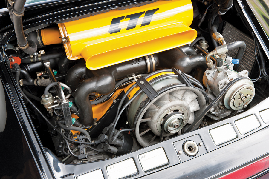The engine was modified with larger-bore pistons and cylinders to move up to 3,367 cc, with a Bosch Motronic ignition similar to that of the Porsche 962 race cars. There were two large turbochargers, twin intercoolers, and the typical huge RUF yellow air cleaner on top. To Road and Track, RUF specified output at 469 horsepower. Later specs read 496 horsepower, while rumors suggested up to 550, with 457 foot-pounds of torque.