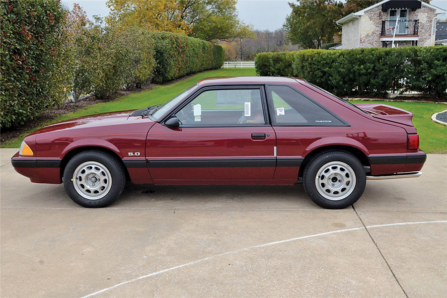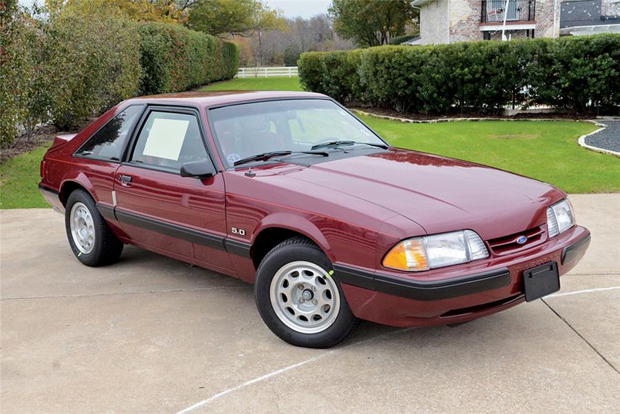 This LX hatchback is powered by a 5.0-liter electronic fuel-injected high-output engine and 5-speed manual transmission. It’s equipped with power steering, power brakes, power windows and air conditioning. Finished in Cabernet Red with Scarlet Red interior, it features the original window sticker, and all factory build/shipping markings and decals are still on the car.