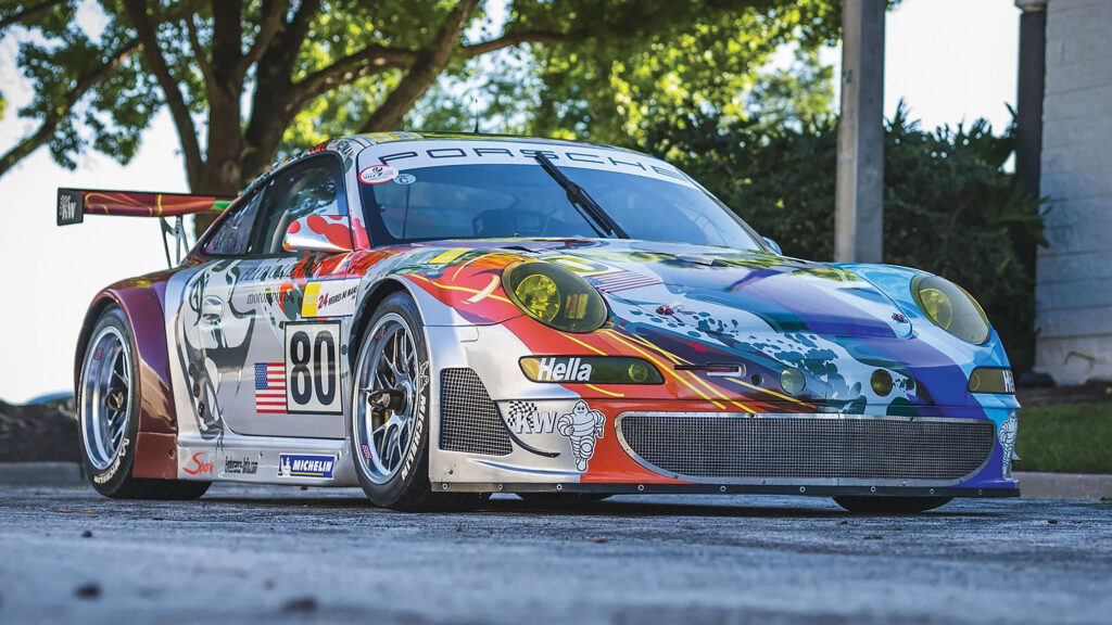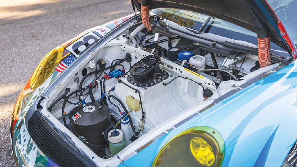 After retiring in 2007, the RSR returned to Porsche Motorsport in Germany for a refresh. Today, the Flying Lizard art car appears very much as it did after restoration, with only two private owners since. An attendee of Rennsport Reunion VI and VII, it was serviced in September 2023 by Alegra Motorsports with new race belts, all-new fluids, a certified fire bottle, engine refresh (five hours of use since), and a new clutch since 2018. It is sold with a spares package, which will be made available to the winning bidder, with shipping to be paid for by the buyer.