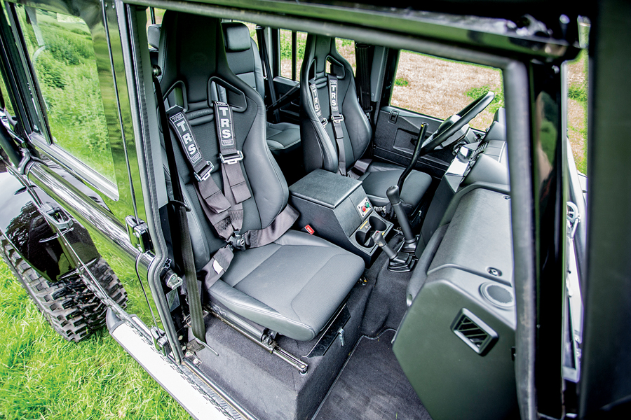 This Landie has massive wheels and 37-inch all-terrain tires. The engine was chipped up from 120 bhp to 185 (and 368 ft-lb of torque). The Landie also was equipped with internal and external roll cages and SVX rear badging.